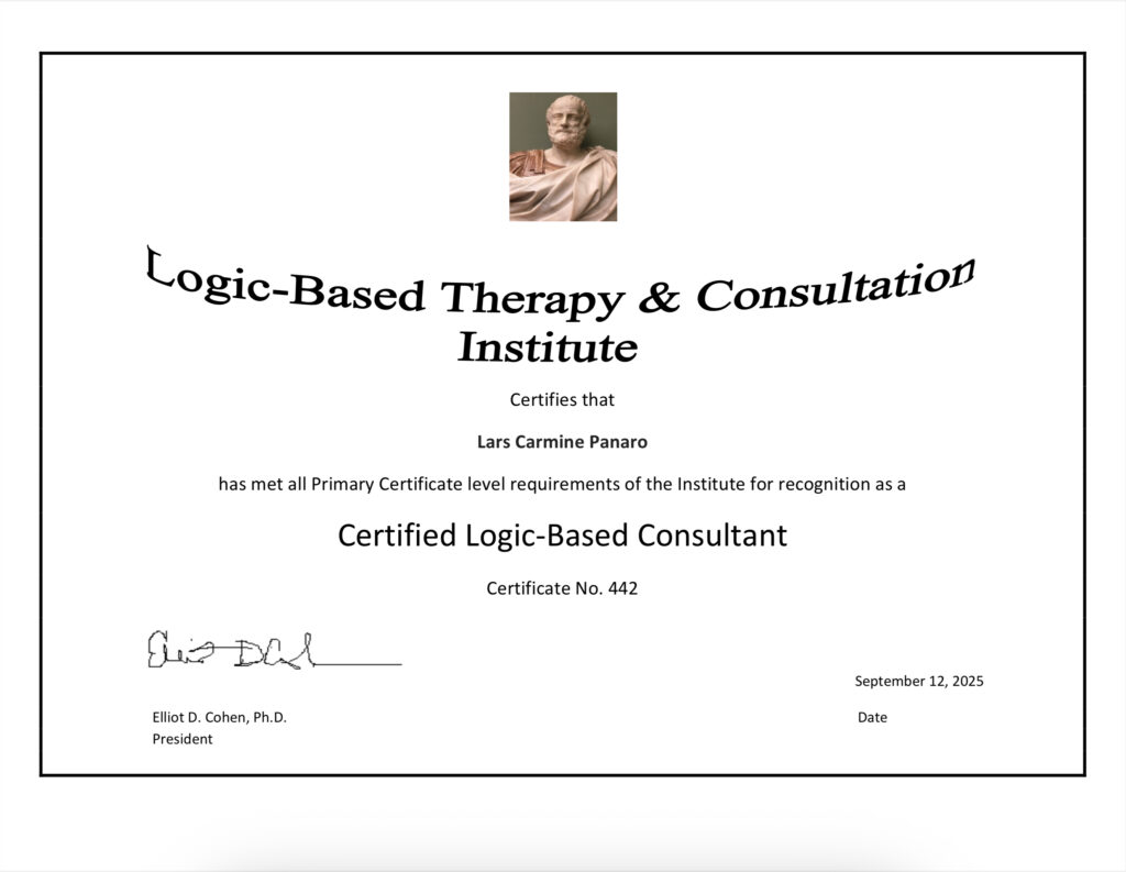 I am officially certified as a Philosophical Consultant to practice LBC (Logic Based Consulting) by the NPCA (National Philosophical Counseling Association). This means that I do not treat psychiatric disorders, nor is LBC or any other form of philosophical counseling that I offer, a replacement for psychiatric treatment by a licensed mental health practitioner. You can see the differences in practice areas here: https://npcassoc.org/practice-areas-boundaries/